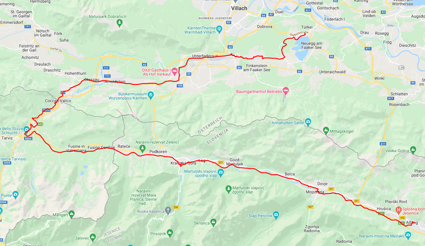 Die Strecke führt grossteils auf einer alten Bahntrasse auf der anderen Seite der Karawanken, entlang dem Fluss Save, entlang am Rand des Triglav Nationalparks. Die Grenze zwischen Österreich und Italien wird zwischen Karawanken und Jülischen Alpen überquert.